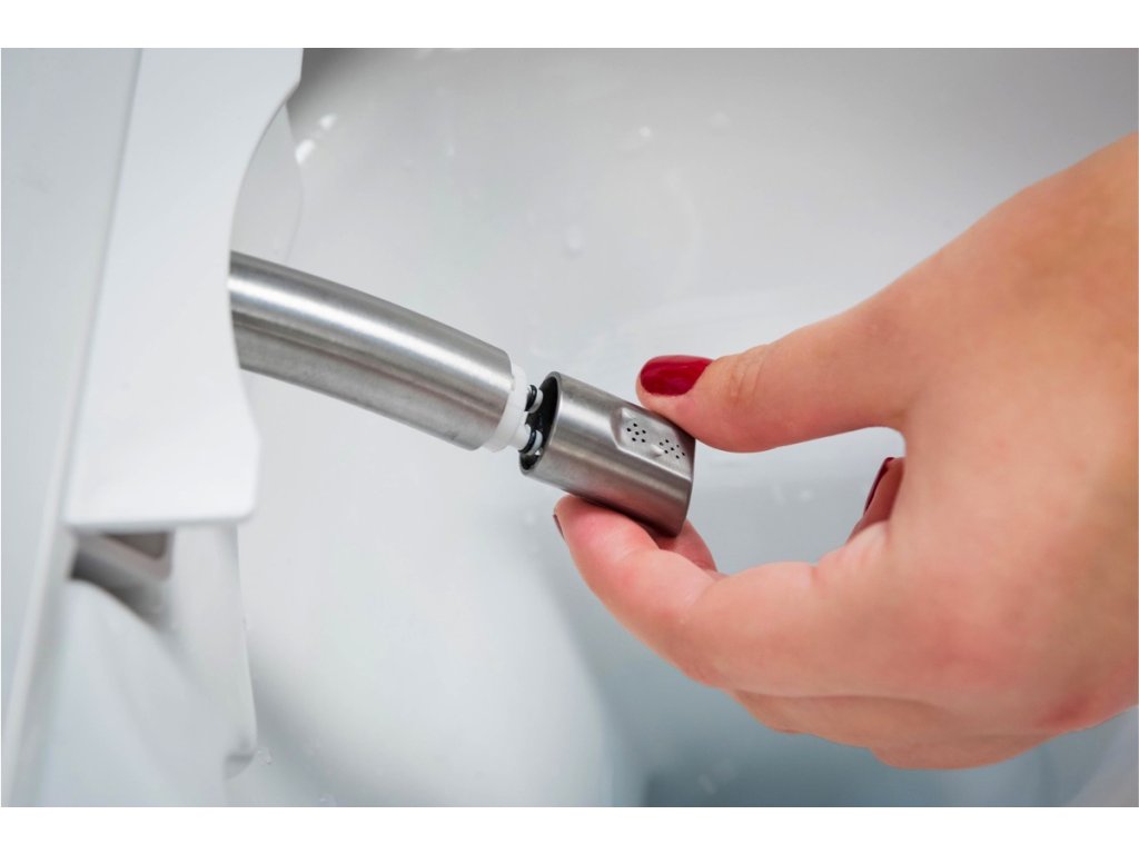 Účinné a šetrné bezokrajové splachování WC mísy s technologií RimFree/Rimless. WC mísa bez uzavřeného oplachovacího kruhu výrazně usnadní jinak složité čištění vnitřku toalety. Automatické samočištění sprchové trysky, před zahájením i po ukončení každého mycího cyklu, zajistí maximální čistotu jemného výsuvného mycího zařízení, které se dokonale polohově přizpůsobí potřebám každého uživatele. Praktické rychloúchyty umožní snadné odejmutí toaletního prkénka pro běžnou údržbu exteriéru keramiky s hladkou glazurou velice odolnou proti znečištění bakteriemi a jinými mikroorganismy. Přívod vody pro spršku je opatřen skrytým vyměnitelným filtračním systémem přívodní studené vody, kterou si INTEGRA+ dohřeje na požadovanou teplotu.