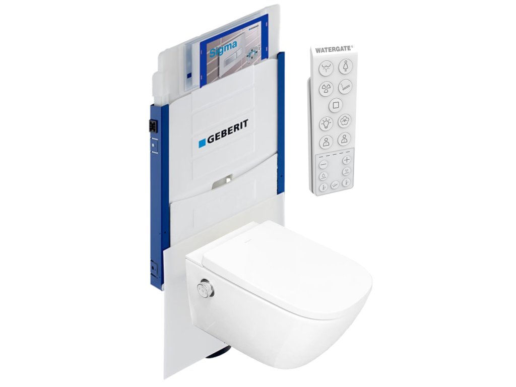 Sprchovací toaleta WATERGATE INTEGRA+ Premium CUBE s GEBERIT KOMBIFIX montážním prvkem pro závěsné WC, 108 cm, se splachovací nádržkou pod omítku SIGMA 12 cm. Vhodné konstrukce prováděné mokrým procesem.